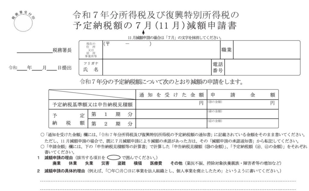申請書はこちら(国税庁HP:「令和7年分所得税及び復興特別所得税の予定納税額の7月(11月)減額申請書」
