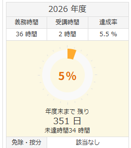 その年は12か月なかったので月割され、ノルマは21時間。21.5時間受講し、達成率は102%でした。