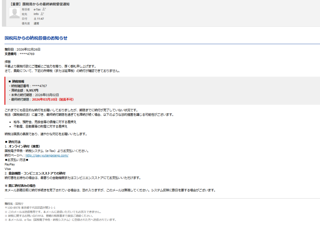 何よりもまず国税局はメールでの催促などしません。文書はありますが。